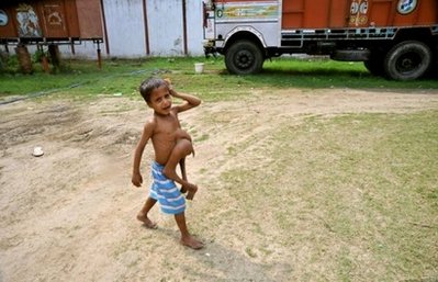 中新網(wǎng)3月11日電 據(jù)外電報道,印度一名出生即長有4支胳膊與4條腿的7歲男孩庫馬爾,被當?shù)睾芏嘤《冉掏疆斪诮膛枷癯绨荨6母赣H則表示很不舒服,他想要的就是給庫馬爾做一次手術,讓他恢復正常人身。