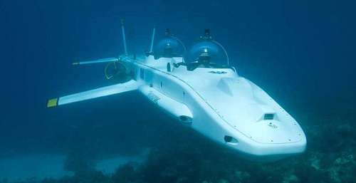 中新網11月9日電 據香港《大公報》援引英《每日郵報》網絡版八日消息:個人潛艇的設計日新月異,美國設計的一款小型飛機模樣的潛艇備受矚目,因為它可以潛入水底一千英尺以上,時速高達六海里,可以讓玩家三百六十度探索海底世界。這架超級潛艇飛機每架盛惠一百五十萬英鎊,俄羅斯億萬富豪阿布及布蘭森都有意購置一部。