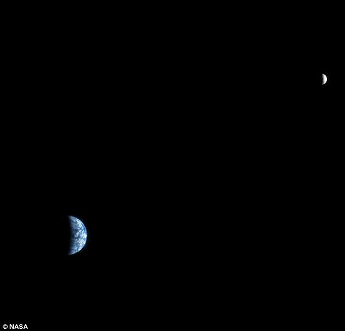 而只有在地球和月球位于太陽對面,繞行火星的探測器才能拍到地球和月球的全景照片,這張照片中,地球的右下角是南美洲西岸。