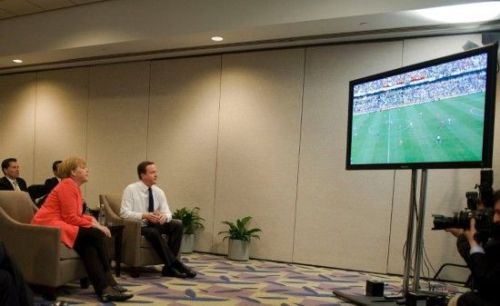 報道稱,卡梅倫和默克爾離開了其他與會領(lǐng)導(dǎo)人,與手下一同觀看英德下半場比賽。結(jié)果德國隊又進兩球,以4-1大勝英格蘭隊。
