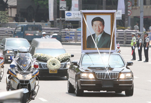 當?shù)貢r間29日凌晨5時,盧武鉉的出殯儀式結(jié)束后,靈車6時許離開慶尚南道金海市進泳邑峰下村,4小時50分鐘后來到首爾。