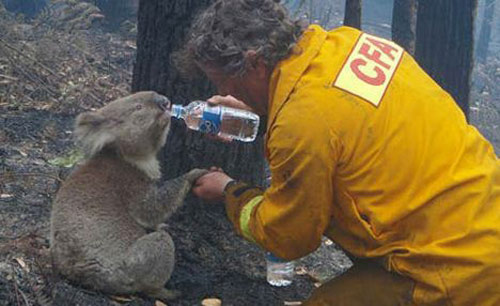 今年二月,由于高溫干旱,澳大利亞維多利亞州發(fā)生了歷史上最嚴(yán)重的林火,造成173人死亡,7500人無家可歸。當(dāng)時,在距墨爾本東南約120公里處的維多利亞州山火現(xiàn)場,一位名叫特里的消防員救出了這只樹袋熊,并用礦泉水瓶給它喂水。這個畫面被特里的同事用手機(jī)拍攝下來,此后被媒體廣泛傳播,這只樹袋熊頓時成為世人關(guān)注的焦點(diǎn)。