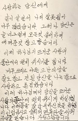 信中稱:“在一起生活的過程中我犯下的錯(cuò)誤太多了。但你總是寬容地原諒一切過錯(cuò),還很愛惜我,真的很感謝你。希望今后能在上帝溫暖的愛的懷抱中安息。你挺過了極其苦難和悲傷的人生,我真的很愛、很尊敬你。你的妻子李姬鎬!