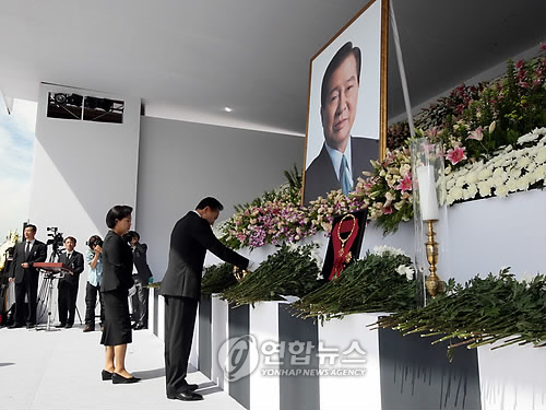 李明博當(dāng)天與夫人金潤玉女士和青瓦臺(tái)政務(wù)首席秘書孟亨奎、發(fā)言人李東官一同進(jìn)行了吊唁。