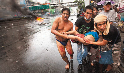 紅衫軍集會(huì)地點(diǎn)附近昨繼續(xù)傳出斷續(xù)的槍聲和爆炸聲,示威者焚繞車胎作路障,一間商店起火,一間7.11便利店被搶掠糧水,盤谷銀行一間分行前晚亦發(fā)生爆炸。數(shù)百紅衫軍上周六起在工人活躍的孔堤港聚集,企圖分散軍方在商業(yè)區(qū)的注意力,開(kāi)辟新戰(zhàn)場(chǎng)。
