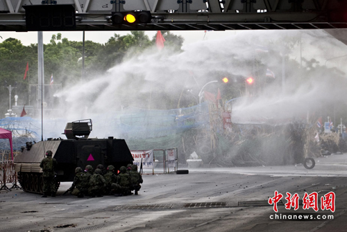 5月19日,泰國軍隊開進(jìn)紅衫軍集會區(qū)域,展開“清場”行動。行動導(dǎo)致5人死亡,多人受傷。當(dāng)天下午,7名紅衫軍領(lǐng)導(dǎo)人集體自首,并宣布結(jié)束集會示威。