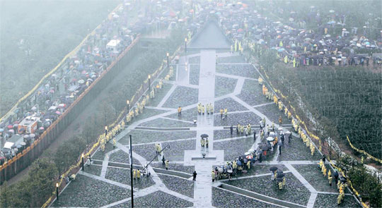 據(jù)報(bào)道,當(dāng)天,在舉行盧武鉉逝世一周年追悼?jī)x式的峰下村,大雨如注,然而前來(lái)追悼的客人仍然絡(luò)繹不絕。