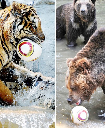 中新網(wǎng)6月10日電 據(jù)韓國《中央日報(bào)》網(wǎng)站報(bào)道,2010年南非世界杯開賽在即,動(dòng)物們也喜歡世界杯,加入了如炎熱的天氣般熾熱的世界杯浪潮。在韓國,動(dòng)物園內(nèi)的老虎和熊在水中興致勃勃地玩起了足球。