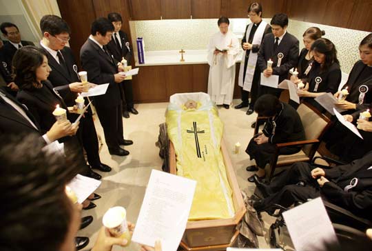 儀式過(guò)程沒(méi)有對(duì)外公開(kāi),只有金大中的遺屬和一些工作人員參加。金大中生前的秘書崔敬煥說(shuō),“金大中穿著夫人李姬鎬事先準(zhǔn)備的壽衣,被安置在繪有鳳凰(象征總統(tǒng)地位的標(biāo)志)的棺木里!