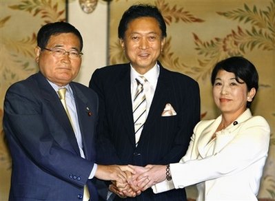 三黨正式達(dá)成協(xié)議后,鳩山邀請社民黨黨首福島瑞穗、國民新黨代表龜井靜香入閣。除已經(jīng)內(nèi)定的主要內(nèi)閣成員外,內(nèi)閣其他成員的人選也將于本周內(nèi)相繼確定。