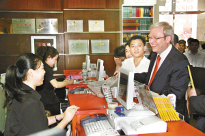 “澳大利亞總理喜歡有關(guān)中國傳統(tǒng)文化的圖書”,記者近日從北京發(fā)行集團獲悉,8月8日上午,前來北京參加第29屆奧運會開幕式的澳大利亞總理陸克文在澳大利亞駐華大使芮捷銳博士的陪同下走進王府井書店選購圖書。