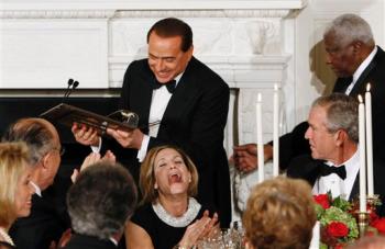 此前媒體的報道說,即將離任的美國總統(tǒng)布什在白宮為來訪的貝盧斯科尼舉行了晚宴,兩人在宴會上表現(xiàn)的非常親密,在舉杯后互碰面頰,布什總統(tǒng)還愉快地致了告別辭。一位官員稱:“政治家們表現(xiàn)得如此親密是不多見的,他們看起來更像是好友而不是世界領(lǐng)導(dǎo)人!