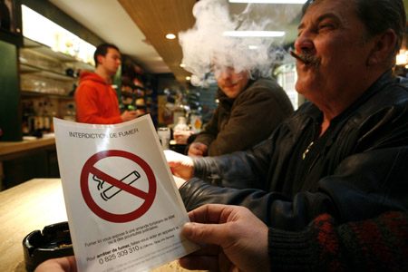 煙霧彌漫一直是法國人泡吧的特色,但為了跟上全民健康的歐洲潮流,法國終于從今年元月開始對28萬家咖啡館、酒吧和餐館等娛樂型公共場所實行禁煙令,成了歐洲最后一個實行類似禁令的國家。按照法規(guī),如果有煙民在公共場所不幸被執(zhí)法者逮到,每次將被罰68歐元,允許他吸煙的公共場所經(jīng)營者也將面臨135歐元至750歐元的罰款。另一方面,為配合戒煙,政府還煞費苦心地將戒煙藥列入國家補助范圍。