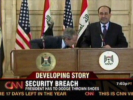 12月14日,還有37天即將卸任的美國總統(tǒng)布什突訪伊拉克。當(dāng)天下午,在與伊拉克總理馬利基一同出席的新聞發(fā)布會上,兩位領(lǐng)導(dǎo)人剛握完手,扎伊迪突然跳起,將自己腳上的兩只鞋子脫下,連續(xù)向布什砸去。雖然布什低下頭靈敏地躲過了飛來皮鞋,但扎伊迪的兩只皮鞋還是重重地砸在了布什身后的美國國旗上。