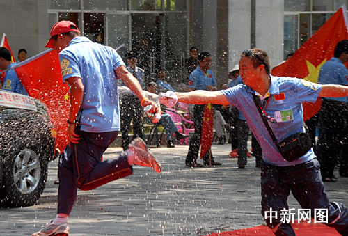 興奮的車手們用慶功的美酒開(kāi)起了玩笑