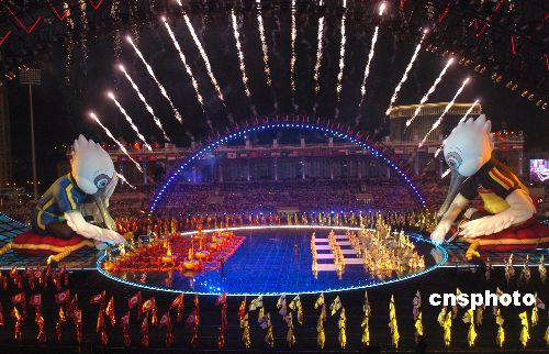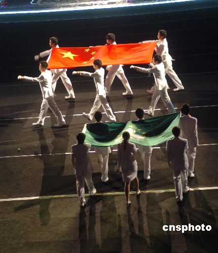 十月二十六日晚,中華人民共和國(guó)國(guó)旗和澳門特別行政區(qū)區(qū)旗升起在澳門運(yùn)動(dòng)場(chǎng),第二屆亞洲室內(nèi)運(yùn)動(dòng)會(huì)開(kāi)幕式隆重舉行。澳門特首何厚鏵、國(guó)際奧委會(huì)主席羅格等嘉賓出席開(kāi)幕式。開(kāi)幕式上舉行了“和諧澳門,快樂(lè)竟技”大型文體匯演。第二屆亞洲室內(nèi)運(yùn)動(dòng)會(huì)將舉行十七個(gè)大項(xiàng),一百五十一個(gè)小項(xiàng)非奧運(yùn)項(xiàng)目比賽和三個(gè)示范項(xiàng)目表演,是澳門主辦的規(guī)模最大,要求最高,比賽項(xiàng)目最多的國(guó)際綜合運(yùn)動(dòng)會(huì)。 中新社發(fā) 史利 攝