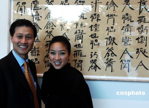 圖為關穎珊和華美銀行董事長兼總裁吳建民一起,欣賞中國當代藝術家徐冰將英文歌詞用中文正楷獨特書法表現(xiàn)的《巴布狄倫的脫變時節(jié)》。
