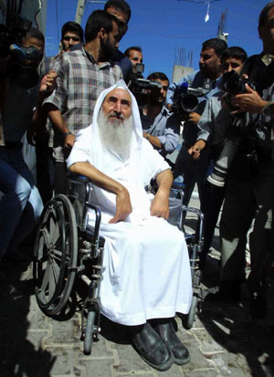 2005年6月,我見到亞辛,白衣老人坐在輪椅上,看起來十分瘦小,兩只手無力地垂在胸前。銀白的胡須、凌厲的鷹鉤鼻。他的聲帶顯然受損,聲音好像一把刀片刮在玻璃上,尖利卻不清楚。如果你距離他超過一米就根本聽不見他在說什么。藍(lán)灰色的眼珠看起來有些渾濁。有時他仰頭向上看,嘴唇微微張開,眼神呆滯;有時他的眼珠又異常靈活,發(fā)出冷冷的光。兩種表情在他臉上交替出現(xiàn)。8年的牢獄生活使亞辛的身體狀況進(jìn)一步惡化,視力、聽覺嚴(yán)重受損,完全癱瘓。
