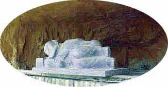 鐘祖洞:鐘離權(quán),又稱(chēng)漢鐘離,坦胸露腹,大眼睛,紅臉面,頭上扎著兩個(gè)丫髻.他為漢時(shí)將軍,兵敗后逃至山谷,遇東華先生傳他金丹火候,金科靈火,又往崆峒山訪道。太上老君身騎青牛,手執(zhí)寶扇,立于面前曰:“普濟(jì)渡世,綿山養(yǎng)功。”鐘離來(lái)到這里,見(jiàn)紫氣繚繞,故在此洞中修行,終于練成八段錦道功。后又往返于崆峒山、綿山兩地,普濟(jì)眾生。八段道功集治病養(yǎng)生為一體。