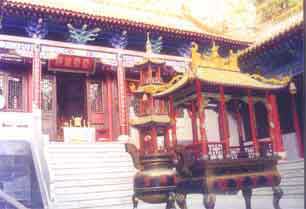 靈霄殿:殿內(nèi)中央供奉的是“玉皇大帝”,左為“天皇大帝”和“南極長生大帝”,右為“紫微大帝”及“后土皇地祗”.兩側(cè)為年、月、日、時四值功曹.道經(jīng)上說:天有三十六層,三清居最上三層.玉帝居三十三天為萬夫之主,主宰人間天上的禍福吉兇,及世界兵革、劫運,是民間信仰的最高神靈.左、右四位大帝,分別統(tǒng)帥萬星、萬雷、萬靈、萬地,以輔佐玉皇.傳說四值功曹體察人間善惡功過,時記月累,年滿上奏玉帝.臘月廿五玉帝下界巡世, 以人們所做的善惡或賜;蚪祼。這天古代皇帝都要舉行盛大的祭天活動,以求國泰民安,天下太平.靈霄殿的兩壁畫的是“太乙救苦天尊”和“玄天上帝”帶領(lǐng)各自部下神將朝拜玉帝,奏事請旨的場面.畫中人物栩栩如生,神態(tài)端莊各異,體現(xiàn)了天界的莊嚴和諸神的無邊法力.當年唐玄宗為感謝玉皇大帝的點化、護佑之恩,命人在這里修建了靈霄殿以及九曜星君殿和六丁六甲殿。