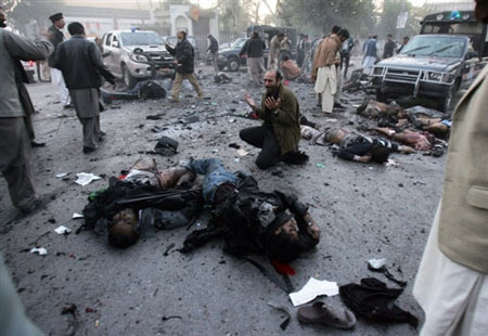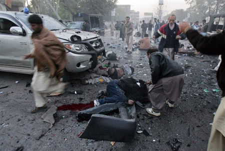 中新網(wǎng)12月27日電 據(jù)法新社報(bào)道,道巴基斯坦前總理貝-布托今日在競(jìng)選集會(huì)上遭到炸彈襲擊,不治身亡。圖為爆炸現(xiàn)場(chǎng)。