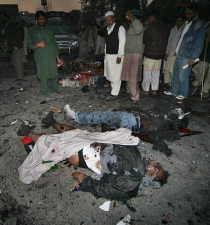 中新網(wǎng)12月27日電 據(jù)路透社報道,巴基斯坦前總理貝-布托今日在競選集會上遭到炸彈襲擊,不治身亡。圖為爆炸現(xiàn)場。(關(guān)新)