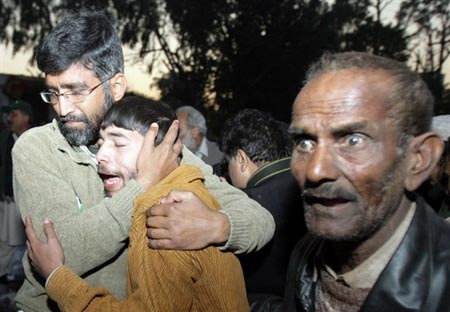 中新網(wǎng)12月27日電 據(jù)法新社報(bào)道,巴基斯坦前總理貝-布托今日在競(jìng)選集會(huì)上遭到炸彈襲擊,不治身亡。圖為貝-布托支持者悲痛萬(wàn)分。(關(guān)新)