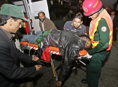 中新網(wǎng)12月27日電 據(jù)法新社報(bào)道,巴基斯坦前總理貝-布托今日在競(jìng)選集會(huì)上遭到炸彈襲擊,不治身亡。圖為救援人員搶救傷者。(關(guān)新)