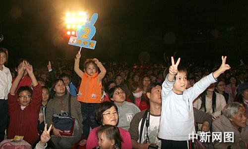 一月十日晚,臺灣“立委”候選人周守訓(xùn)造勢晚會上,不少兒童也熱情參與。 作 者:孫自法
