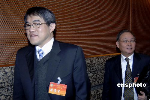 香港已故愛國(guó)人士霍英東三子霍震宇(左)作為新增補(bǔ)委員步入會(huì)場(chǎng)。