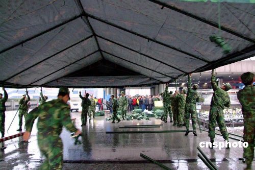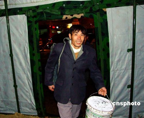 1月27日,南京軍區(qū)“硬骨頭六連”所在師接到杭州市政府請求支援電話,派出200余名工兵,火速趕往杭州火車站。官兵們寒著風雪嚴寒,很快搭設好12頂野戰(zhàn)帳篷,并在帳篷里鋪設了草墊子,為滯留旅客提供休息之地。滯留在車站的民工旅客走進野戰(zhàn)帳篷,臉上露出笑容,高興地說:今晚不會挨凍了,感謝黨和人民解放軍。據車站負責人介紹,因冰雪天氣影響,這天約有2萬名旅客滯留杭州火車站。中新社發(fā) 邱柏星 攝