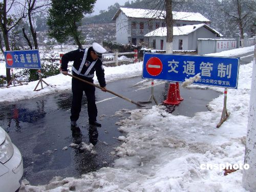 1月中旬以來,江西宜春遭遇幾十年一遇的冰雪災(zāi)害天氣。2月3日上午,江西宜溫公路被迫關(guān)閉,宜春交警冒著嚴寒疏導(dǎo)交通,11點30分實現(xiàn)單線行車。中新社發(fā) 彭小榕 攝