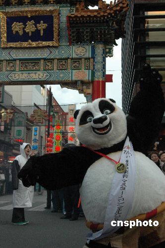 圖為游行隊(duì)列中的超級大熊貓?jiān)谥腥A街匾額下向游客揮手致意。