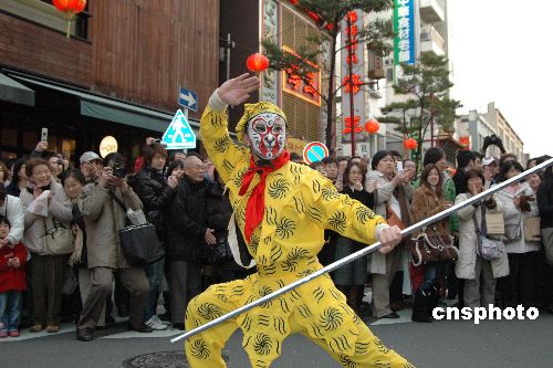 圖為游行隊(duì)列中深受日本民眾喜愛的孫悟空以其高超的功夫博得一片喝彩。
