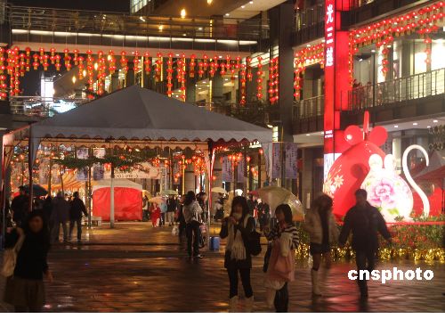 為營造春節(jié)的歡慶氣氛,臺灣許多商業(yè)區(qū)都做了精心的裝飾。圖為臺北新光三越的廣場前中國傳統(tǒng)的大紅燈籠高高掛。