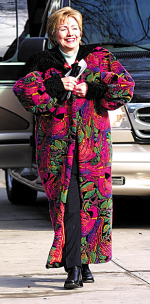 2000年,希拉里參選紐約州參議員,竟以一件大紅大綠又大紫的臃腫長(zhǎng)褸亮相。她自嘲說:“我是循環(huán)再用理念的忠實(shí)信徒,連地毯也會(huì)翻用。”