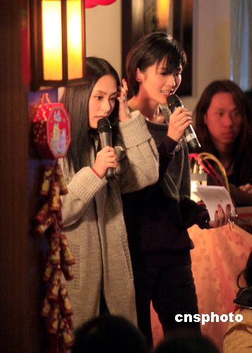 涉及疑似藝人淫照風(fēng)波的香港歌手鐘欣桐(阿嬌)(左),二月十一日下午到香港英皇中心與歌迷進(jìn)行新春聚會,并會晤傳媒,為裸照風(fēng)波宣讀聲明,但期間不接受記者提問。