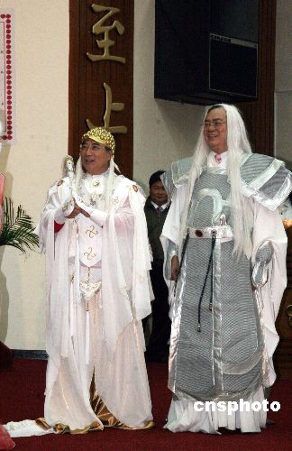 臺灣第七屆“立法院”十二日舉行新春團拜,院長王金平、副院長曾永權分別扮演布袋戲角色。王金平扮演的是“一頁書”,這個角色是象征正道的精神指標;曾永權扮演“葉小釵”,象征一個耿直專一、守信重諾的俠客。中新社發(fā) 徐長安 攝