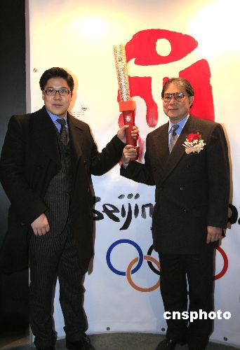 香港體協(xié)暨奧林匹克委員會會長霍震霆攜長子霍啟剛在北京奧運會火炬展品前留影。