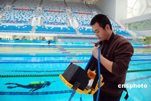 安檢人員用水下目鏡儀檢查北京奧運場館“水立方”水下設施。