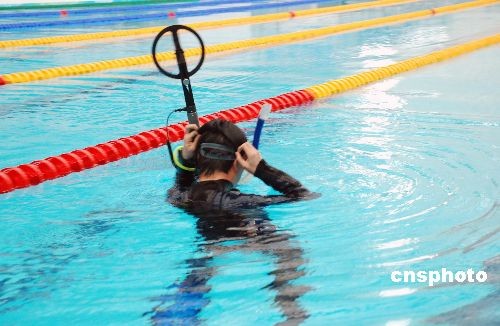 一名警察在對北京奧運(yùn)場館“水立方”水底設(shè)施實(shí)施防爆安全檢查。