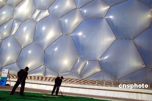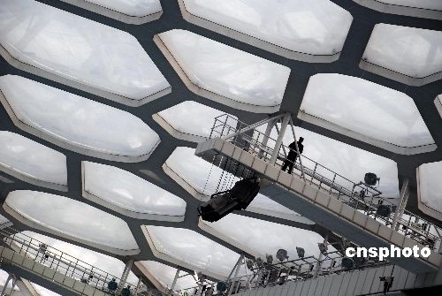 解放軍工兵正對北京奧運場館“水立方”頂層實施安全檢查。