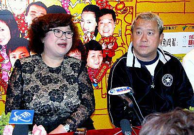 2004年,由廣東電視臺(tái)、香港東方電影出品有限公司等聯(lián)合攝制的第一部粵語(yǔ)賀電影《外來(lái)媳婦本地郎》,一月四日在廣州舉行上映新聞發(fā)布會(huì),香港影星曾志偉、沈殿霞親臨現(xiàn)場(chǎng)宣傳助興。中新社發(fā) 劉衛(wèi)勇 攝