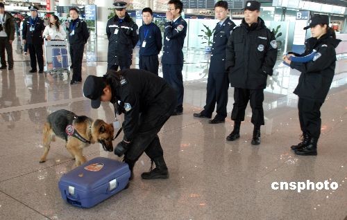 圖為機(jī)場工作人員正在利用警犬檢測行李中的危險品。