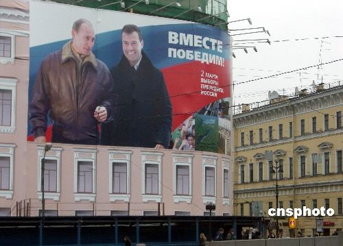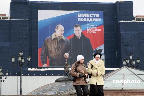 3月1日,在莫斯科紅場旁邊,現(xiàn)任俄羅斯總統(tǒng)普京與政府第一副總理、下屆總統(tǒng)的熱門侯選人梅德韋杰夫的巨幅海報,上書“我們攜手贏取勝利”十分醒目。梅德韋杰夫曾多次表示,他若當選后將繼續(xù)執(zhí)行普京路線。3月2日,俄羅斯將舉行總統(tǒng)大選。中新社發(fā) 田冰 攝