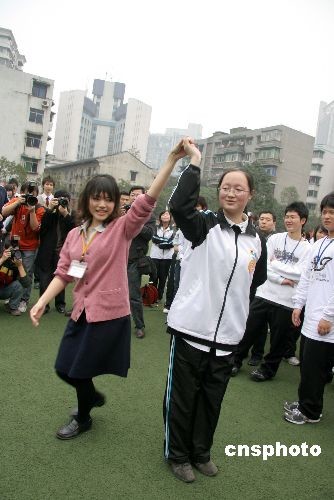 圖為現(xiàn)場兩位跳得最好的女高中生(右為中國女生)在校園里切蹉、展示“舞”藝,增進(jìn)友誼。
