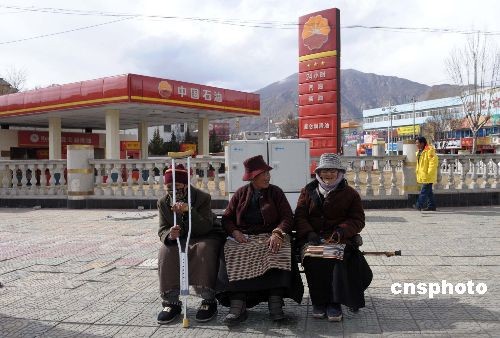 3月20日,三名藏族大嬸坐在拉薩市街頭長椅上曬太陽,享受明媚春光。