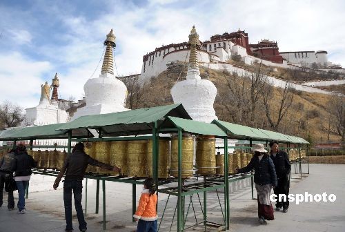 3月20日,拉薩民眾在布達拉宮下的宗角祿康公園內(nèi)轉(zhuǎn)經(jīng)。