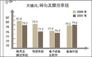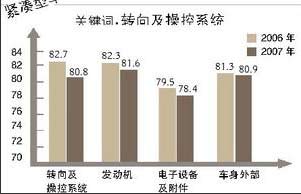 在對去年初始質(zhì)量滿意度的測評指標中,緊湊型轎車“發(fā)動機”環(huán)節(jié)滿意度得分最高,“電子設備及附件”環(huán)節(jié)滿意度得分最低。初始質(zhì)量各環(huán)節(jié)滿意度均低于2006年得分,“轉(zhuǎn)向及操控系統(tǒng)”滿意度降幅最大。