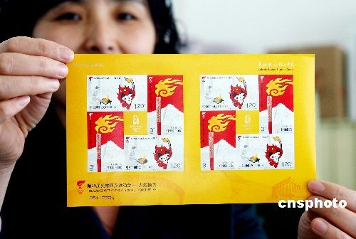 2008年3月24日,國家郵政局發(fā)行《第29屆奧林匹克運動會—火炬接力》紀念郵票1套2枚,小全張1枚。中新社發(fā) 馬健 攝